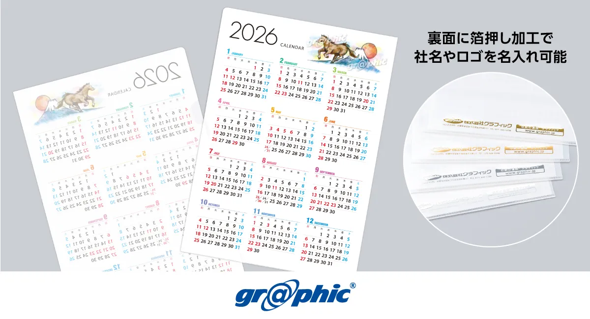 このカレンダーは、すでに印刷済みのクリアファイルに社名データを準備するだけで、箔押し加工で社名やロゴを名入れすることができるため、とても簡単に作成できます。また、カレンダーのデザインは2種類のイラストから選ぶことができ、好みに合わせてセンスよく仕上げることが可能です。この商品は企業のPR活動や年末年始の挨拶状としても適しているため、幅広いニーズに応えるアイテムです。