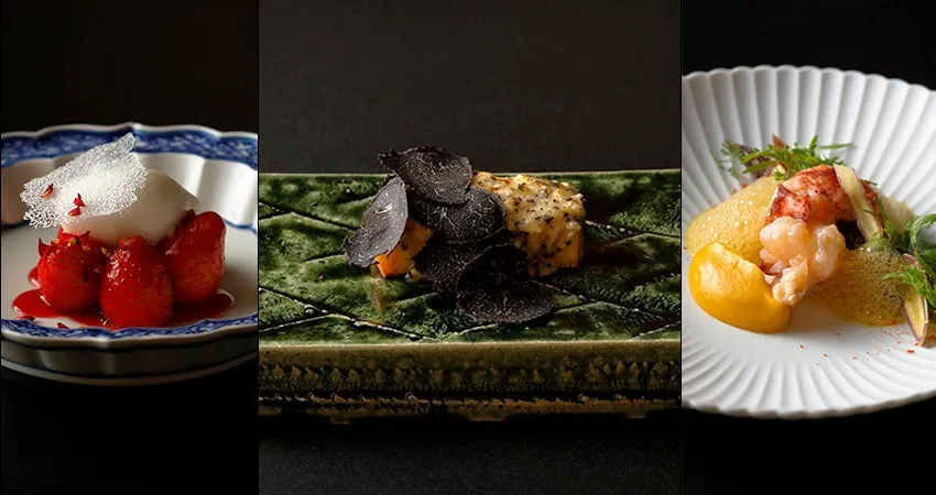 締めには、京丹後産コシヒカリやいくら、菊花を使った香り豊かな炊き込みごはんと、デザートには上杉農園の苺に薔薇とライチを添えたものが用意されています。この時期の特別な風味を大切にしながら、料理はどれも一流の美味しさが詰まっています。