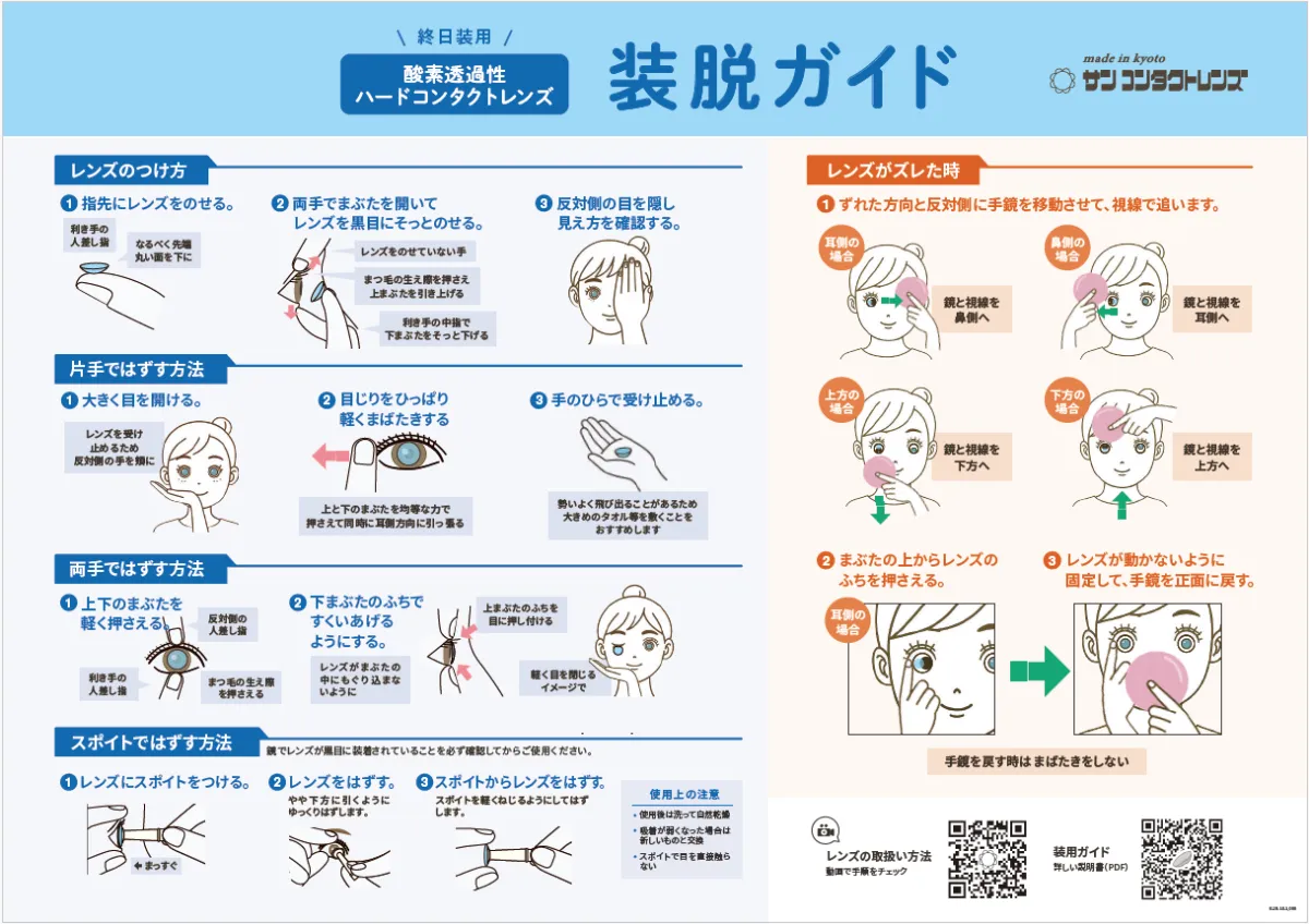 - - 明確な指導:ズレたレンズや誤った装用時の対処法を大きなイラストで示し、視覚的に理解しやすくなっています。