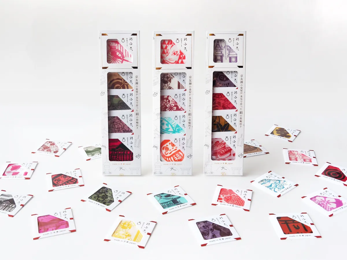 「おふきpetit」は、京友禅の職人によって丹念に染め上げられた絹の指輪拭きであり、日常生活に美しさを添えるアイテムです。手作業で生まれたこの小さな作品は、京都の旅の思い出を分かち合うために、5枚セットで販売されており、それぞれ異なるデザインが施されています。