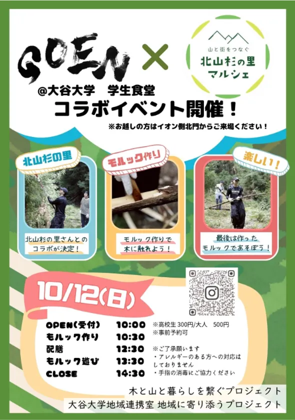 2025年10月12日(日)には、特別イベントとして「木と森と暮らしをつなぐプロジェクト」の一環で、北山杉をテーマにしたワークショップが開催されます。このイベントでは、学生が京都市北区の山の状況を報告し、自ら伐採した北山杉を使ってモルックを作成。その後、参加者同士でモルックの競技体験を楽しむことができます。