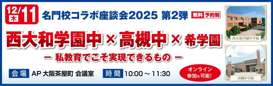 名門校同士のコラボレーションが生み出す、新しい教育の風。西大和学園中学校と高槻中学校、そして希学園の教員による生の声を通じて、皆様が私立教育の魅力や将来の可能性を感じ取ることができることを願っています。ご参加を心よりお待ちしております。
