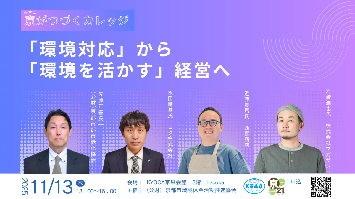 公益財団法人京都市環境保全活動推進協会が主催する「京がつづくカレッジ」セミナーが、2025年11月13日(木)に開催されます。このイベントは、環境問題に関心がある皆さまに向け、具体的な事例を通じて実践的な学びを提供することを目的としています。