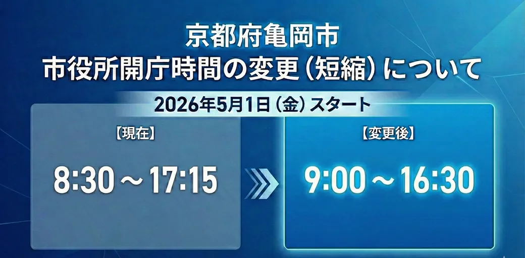 京都府亀岡市では、市民のニーズに応え、より良い行政サービスを提供するため、2026年5月1日(金)から市役所の開庁時間を変更します。これにより、従来の「午前8時30分~午後5時15分」から「午前9時~午後4時30分」へと短縮され、電話受付時間も同様に変更となります。