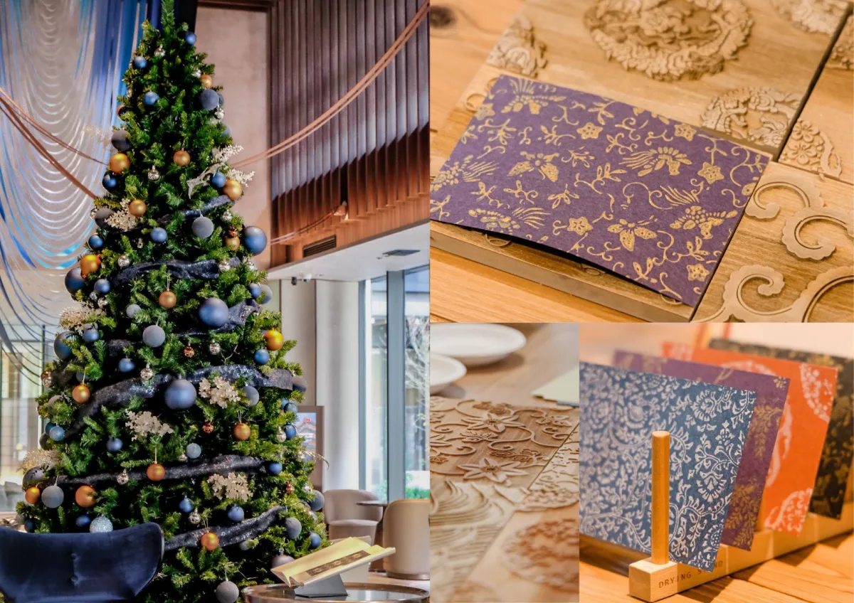 ところで、ロビーには12月1日から25日まで、美しいデュシットブルーが基調のクリスマスツリーが登場します。このツリーは、京都の伝統技術「唐紙」を用いており、透け感のある素材が光を受けて幻想的な演出をします。