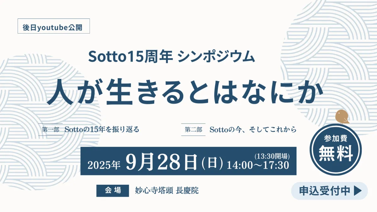 認定NPO法人京都自死・自殺相談センターSottoが設立15周年を記念し、特別なシンポジウム「人が生きるとは何か」を2025年9月28日(日)に京都市右京区の長慶院で開催します。これまでの活動を振り返り、参加者や登壇者と共に「生きるとはどういうことか」を考える貴重な機会です。