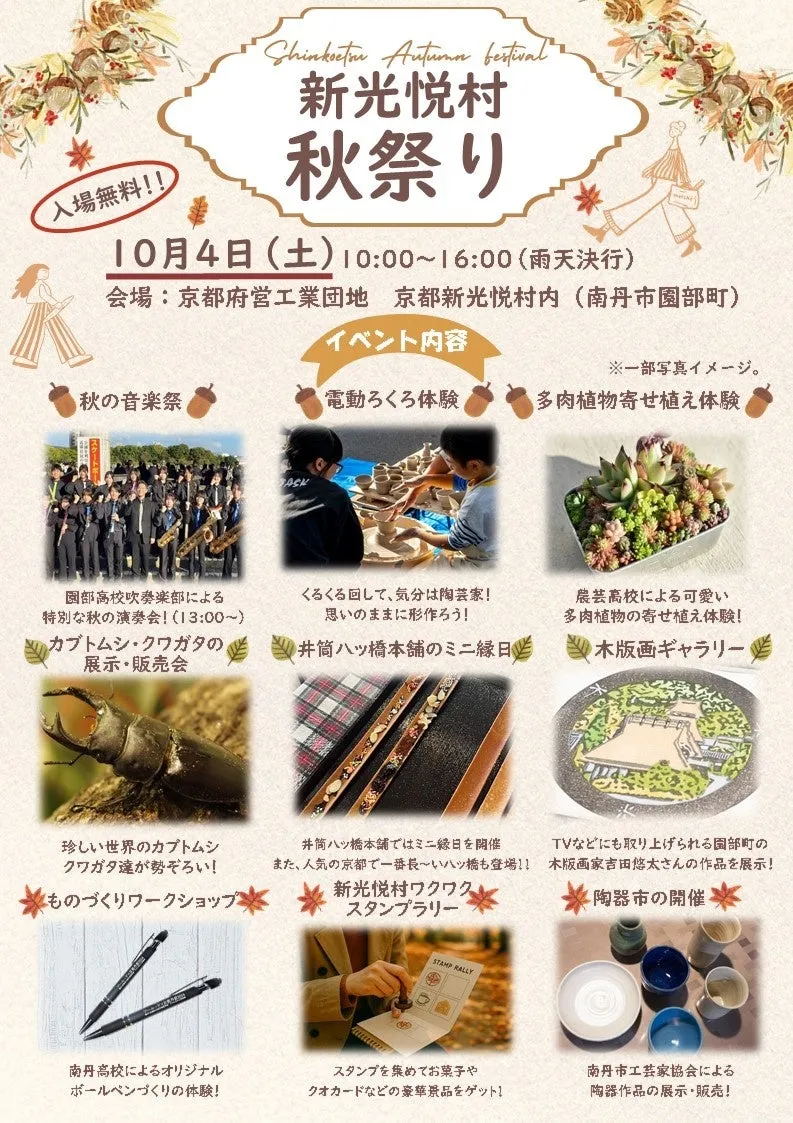 毎年恒例の「京都新光悦村秋まつり」が、今年も10月4日に京都府南丹市で開催されます。このイベントは、地域のものづくり企業や工房と触れ合う貴重な機会を提供しており、多くの方々に愛されています。入場は無料で、事前の申し込みも不要なので、家族や友人と一緒に気軽に訪れてみてはいかがでしょうか。