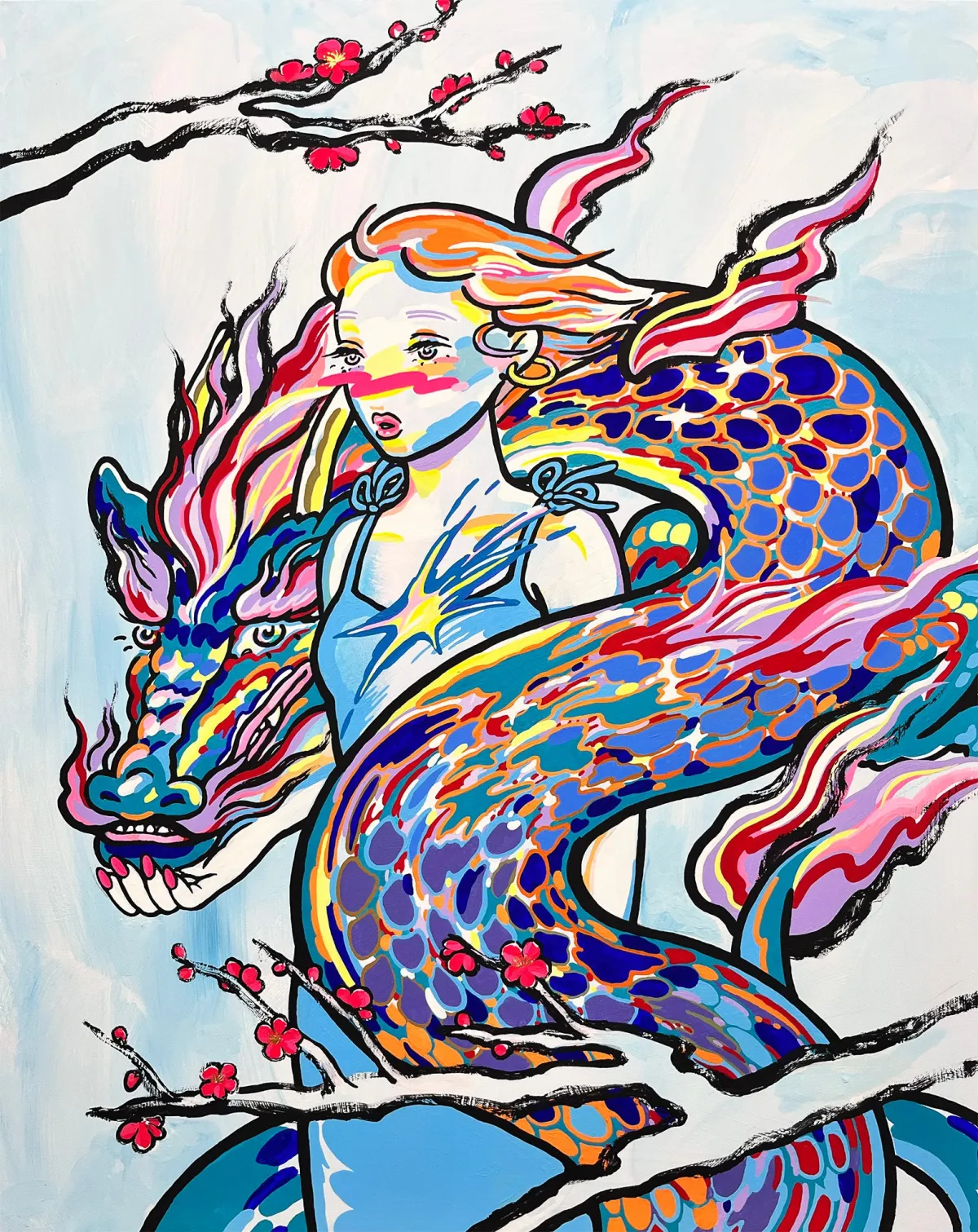 本展のタイトル「春信」は、春の訪れや春の花の開花を知らせる言葉であり、縁起の良いモチーフを主体にしたアクリル画が中心となります。際恵理の作品には、彼女自身のルーツである富山県の仏教や神道の教えが反映されており、「諸行無常」や「内観」などの思想が作品制作の背景にあります。これらのテーマを基に、彼女は観る人々に寄り添いながら、静かに背中を押す作品を生み出したいと考えています。