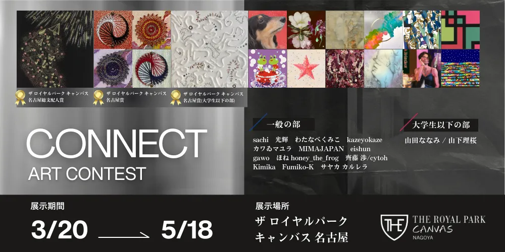 今回のギャラリーは、アートコンテストを通じて選ばれた作品を中心に展示されます。応募は一般部門と大学生以下部門に分かれ、テーマは「CONNECT」。全15作品が選ばれ、その中から特に優れた作品には「ザ ロイヤルパーク キャンバス 名古屋総支配人賞」や「ザ ロイヤルパーク キャンバス 名古屋賞」が贈られます。