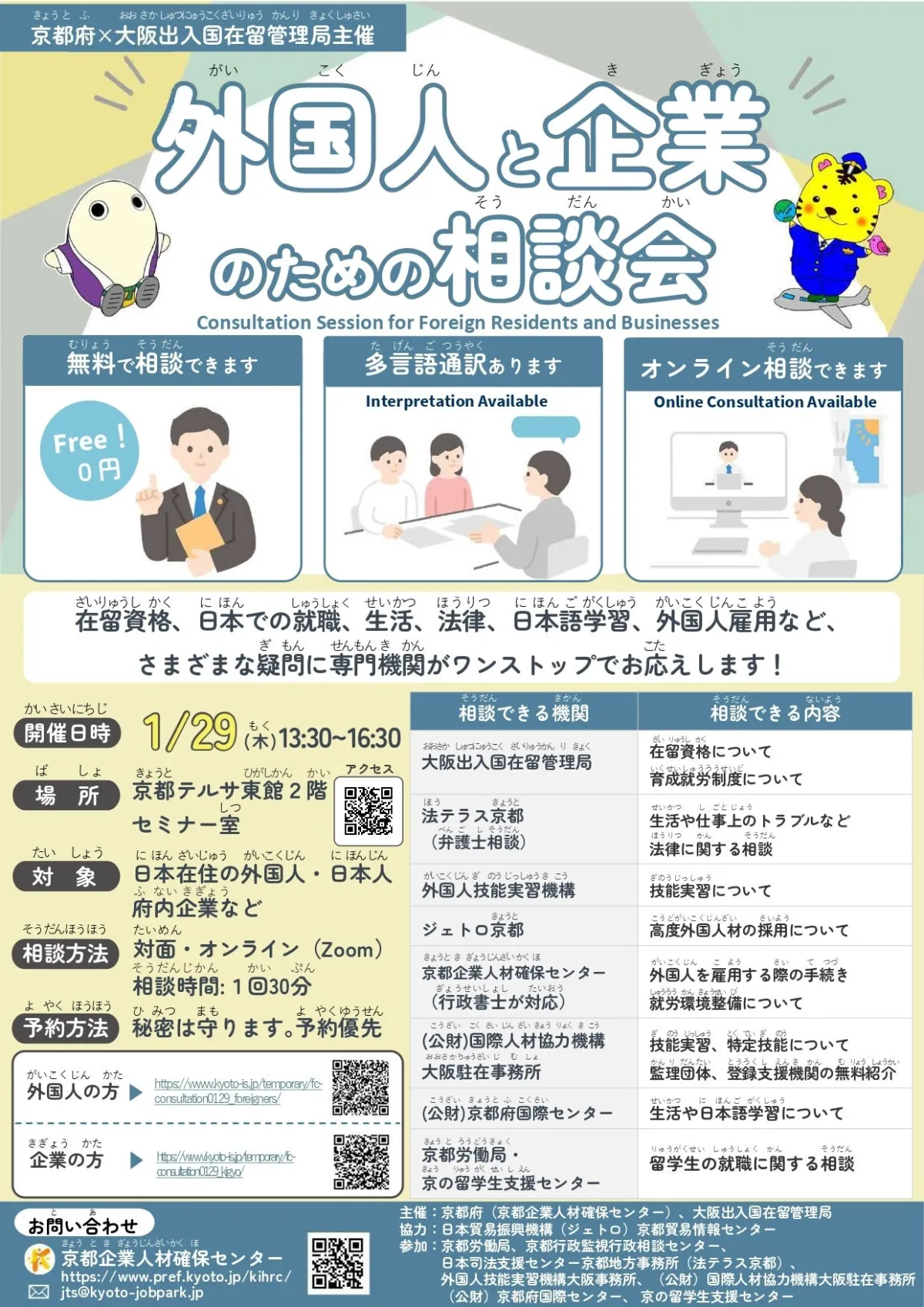 京都府と大阪出入国在留管理局は、外国人材がより安心して暮らせる社会の実現に向けて、受入体制の整備を進めています。その一環として、2024年1月29日(木)に「外国人と企業のための相談会」を開催します。このイベントは企業と外国人の双方を対象にしており、個別相談を通じて悩みや疑問の解消を図ります。