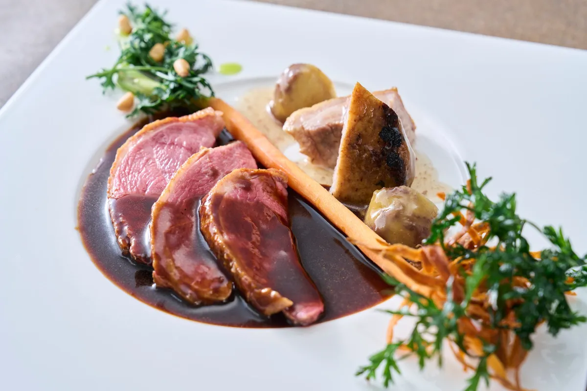 ディナーコースでは、ランチ同様の前菜からスタートしますが、続くメインは「~亀岡市 七谷鴨~」による地産地消の特長を全面に押し出した料理です。七谷鴨はきめ細かな肉質と芳醇な脂を持ち、香ばしくローストされています。フランス料理のサルミソースでさらにその味わいを引き立て、卓越したディナ―体験を提供します。