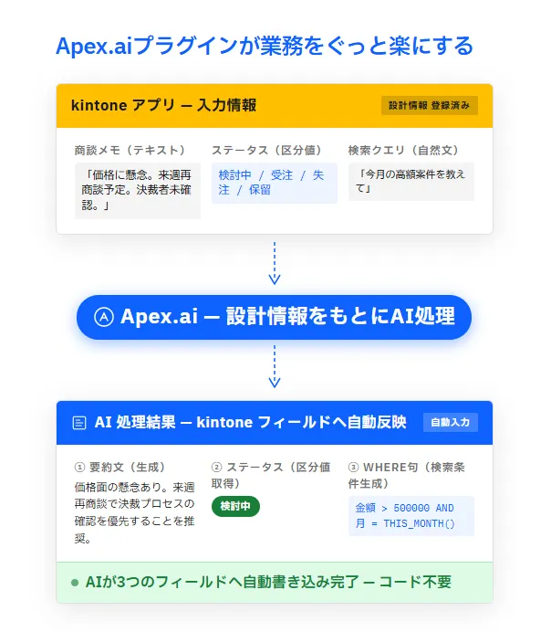現代のビジネスにおいて、業務効率化は常に求められています。特に、独自に構築したアプリを持つ企業にとって、業務ルールに忠実なAI処理ができれば大きな力となることでしょう。そんな期待に応えるのが、株式会社エーエスピーコムが提供するkintoneプラグイン「Apex.ai」です。