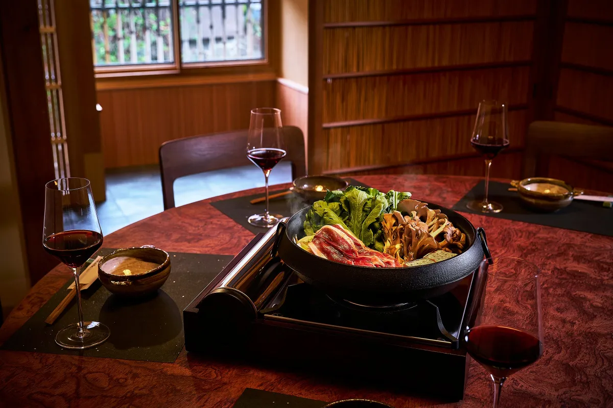 「京都別邸」では、通常の本店とは異なる特別メニューを楽しむことができます。中でも注目は、厳選された国産鴨肉を使用した「別邸限定の鴨すき焼き」。この一品は、鴨の脂の甘みを引き立てる特製割り下で仕上げられており、噛むほどに深い味わいが広がる贅沢な逸品です。