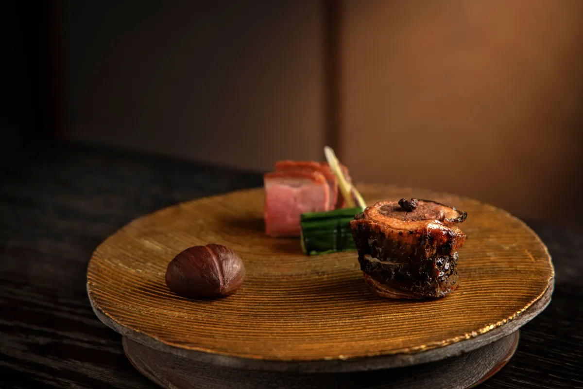他にも、先附の「すっぽん聖護院かぶら大和橘」は、歴史的な冬の料理である「風呂吹きかぶら」を特別な出汁で仕上げ、赤味噌にすっぽんの血を加えた深い味わいが自慢です。椀物は、猪の真丈と牡蠣を組み合わせ、山椒のスパイシーさが程良く効いた一品です。これらの料理は、見た目と味の双方で驚きをもたらします。