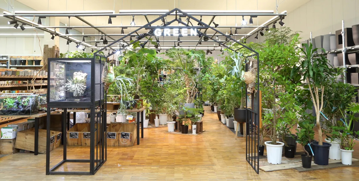 改装の目玉は、まず植物売場の拡張です。観葉植物やアクアテラリウム、ビカクシダなどのトレンドに合わせた品揃えを強化し、多様な選択肢を提供しています。これにより、お客様は自分のライフスタイルにぴったりと合った植物を見つけることが容易になりました。また、植物に合う豊富な鉢やデザイン性の高い雑貨も取り揃えており、インテリアとして植物を楽しめる空間が広がっています。