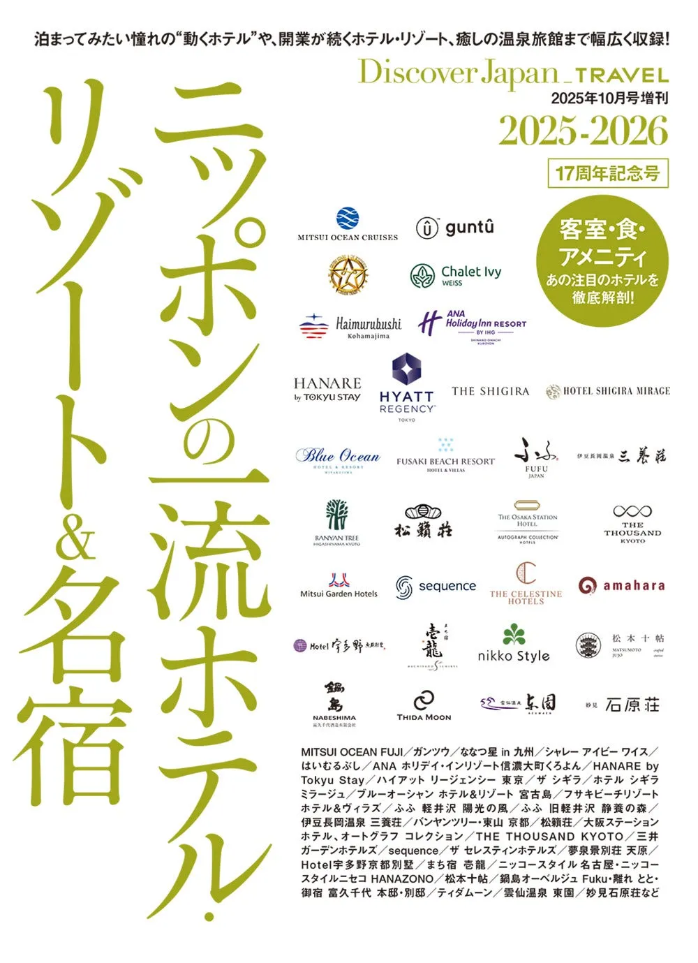 『Discover Japan(ディスカバー・ジャパン)』の2025年10月号の増刊号として発売された「ニッポンの一流ホテル・リゾート&名宿 2025-2026」は、旅行好きにはたまらない一冊となっています。新たなホテルやリゾートが次々に登場する日本の観光地の最新情報を、余すところなく紹介しています。