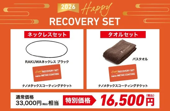 『ハッピーリカバリーセット2026』には、ファイテンの代表商品であるネックレス、または人気のバスタオルが含まれています。それに加えて、特製のナノメタックスコーティングチケットが同梱されており、これを利用してお手持ちの衣類や他のアイテムをリラックスコーティングできます。価格は通常33,000円(税込)のところ、特別価格16,500円(税込)でご提供。この貴重な機会をお見逃しなく!