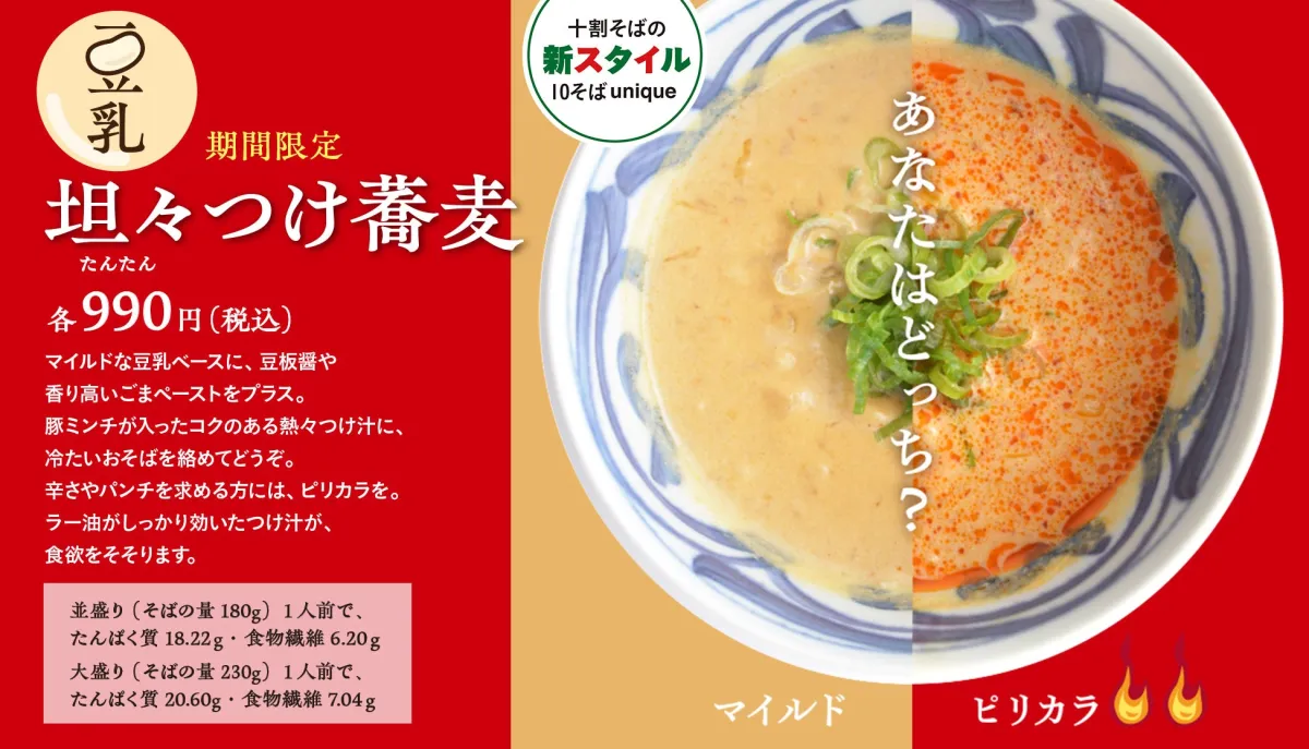 2025年10月29日(水)、京都の「十割蕎麦専門店 10そば」から、話題の新メニュー「豆乳坦々つけ蕎麦」が期間限定で登場します。この新しい蕎麦のスタイルは、マイルドとピリカラの2種類のつけ汁が用意されており、選べる楽しさが特徴です。