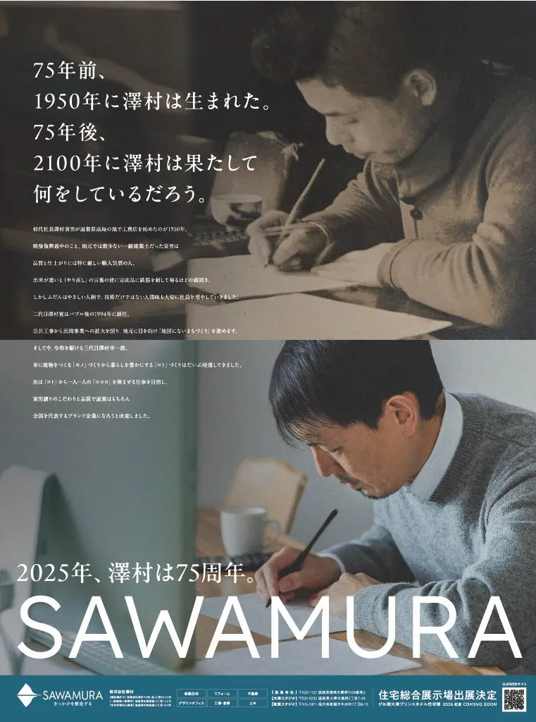 澤村が手掛けた今回の広告には、創業者である寅男氏と現社長の幸一郎氏の姿が重ねられて描かれています。これは、1950年に小さな工務店としてスタートしたSAWAMURAが持つ、技術と品質へのこだわりを示す重要なビジュアルです。広告は「建設会社の領域を超え、これからの時代に必要とされる価値を生み続ける企業へ」のメッセージを込めています。これまでの歴史を振り返りつつ、未来に対する意欲を強く訴えかけています。