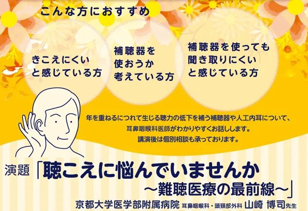 講座のタイトルは「聴こえに悩んでいませんか〜難聴医療の最前線〜」。講師には、京都大学医学部附属病院の耳鼻咽喉科・頭頸部外科に所属する山崎博司先生が登場します。山崎先生は、難聴に関する最新の知見や、補聴器や人工内耳といった選択肢についてお話しします。