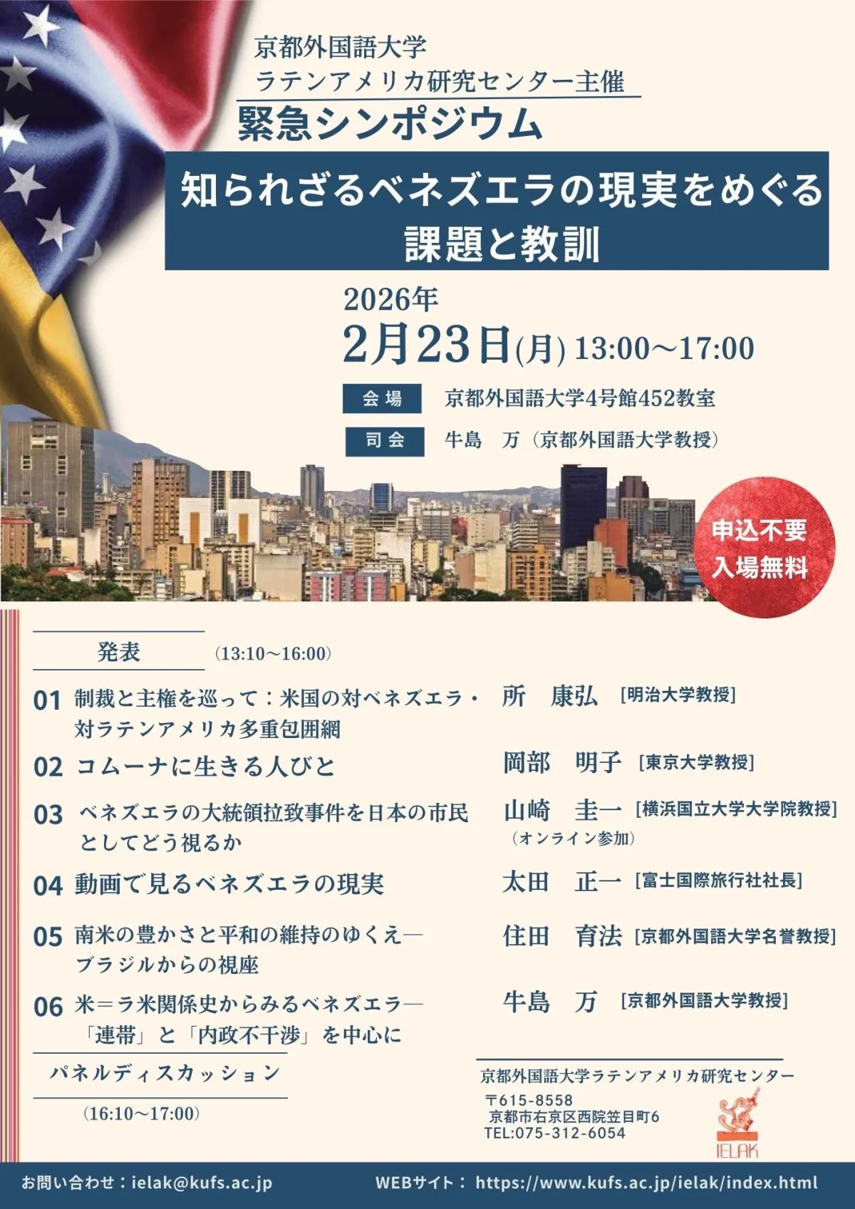2026年2月23日(月・祝)、京都外国語大学にて、緊急シンポジウム「知られざるベネズエラの現実をめぐる課題と教訓」が開催されます。これは、2026年1月に発生した米国によるベネズエラ空爆や、マドゥロ大統領の拘束に関連する国際的な議論を受け、さまざまな視点からこの歴史的な事態を分析し、議論する場です。