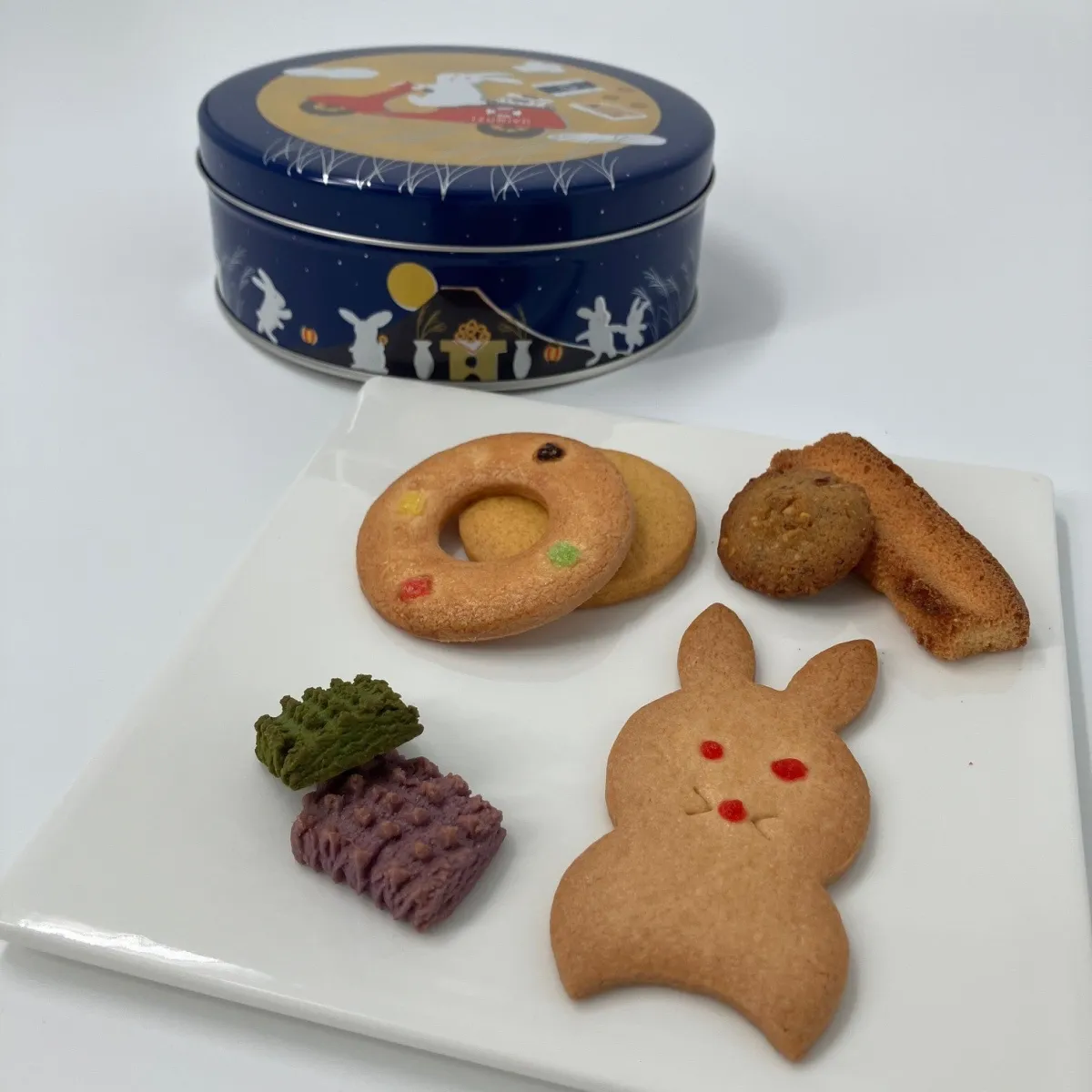まずご紹介したいのは、泉屋が手掛けた「お月見缶」です。可愛いうさぎと満月をあしらった缶には、定番のクッキーや秋の味覚を生かしたクッキーが詰め合わせられています。お土産にもぴったりな一品で、1缶あたり1,836円です。