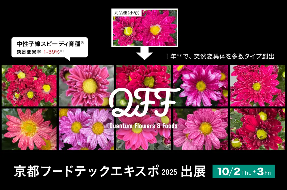 株式会社クォンタムフラワーズ&フーズ(QFF)が出展し、注目されるのは中性子線育種技術の紹介です。この技術は、気候変動や食料安全保障といった現代の食産業が直面している課題に対する解決策の一部とされています。QFFは、イルミナ株式会社と共同で展開する「中性子線育種プラットフォーム」を用い、育種の効率を大幅に向上させることに成功しました。