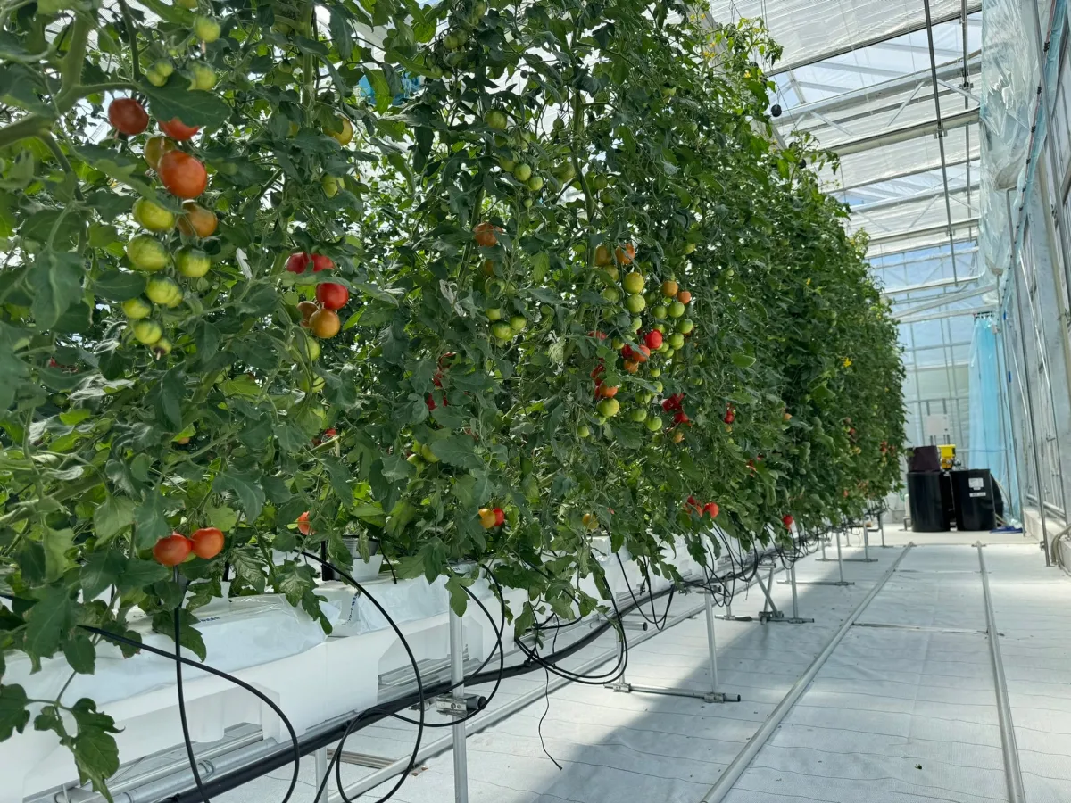 また、土を使わず「養液栽培」という技術により、清潔で持続可能な農業を実現しています。栄養を溶かした水で育てることで、作業はクリーンかつ効率的です。特にトマトは天井高さ4メートルを利用して、10メートル以上に成長させ長期的な収穫が可能です。