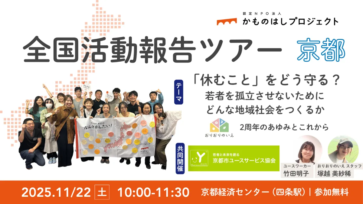 2025年11月22日、京都経済センターにて、「休むこと」の重要性とその実現に向けた地域づくりについて考えるイベントが行われます。このイベントは、認定NPO法人かものはしプロジェクトと京都市ユースサービス協会の共催で、若者支援の現場から孤立を防ぐ地域のあり方を見つめ直します。